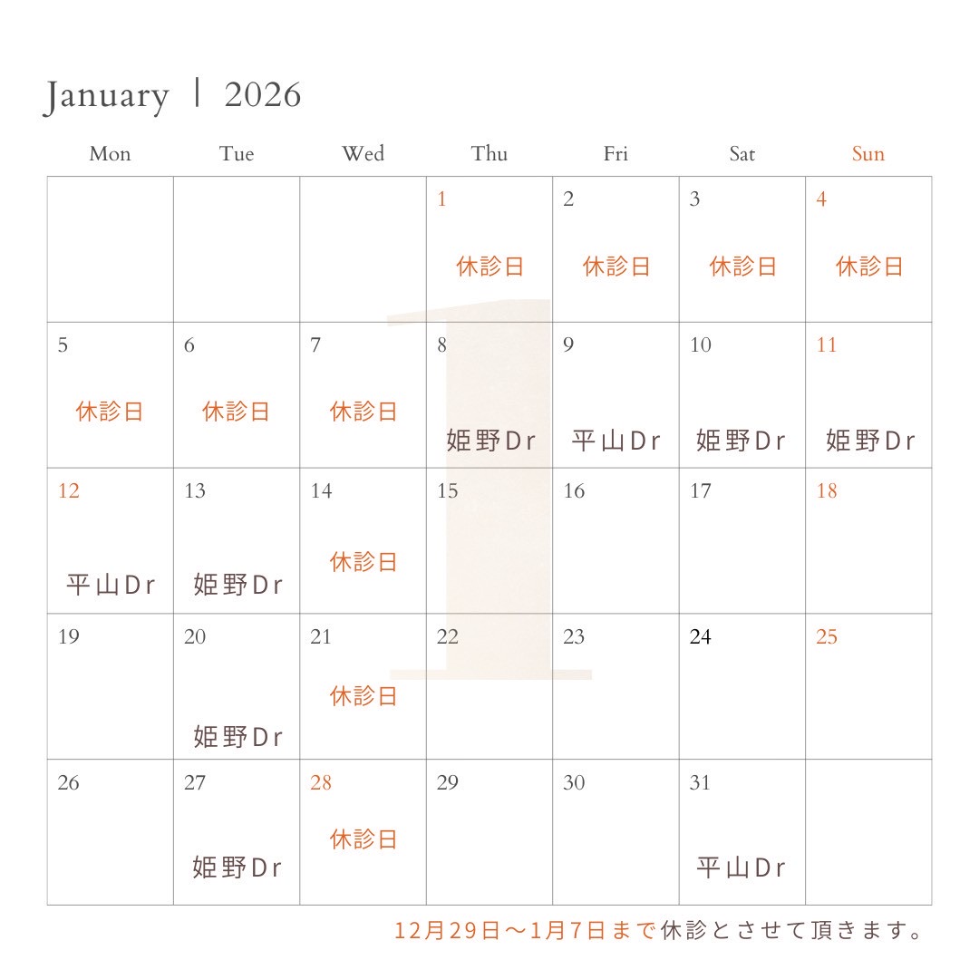 年末年始は2024/12/29(日)~2025/1/3(金)が休診日となります。
